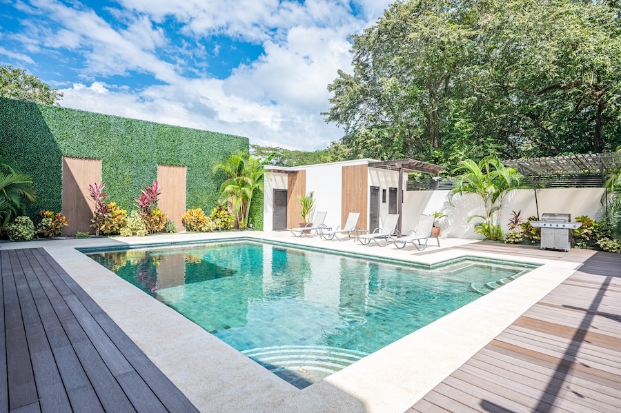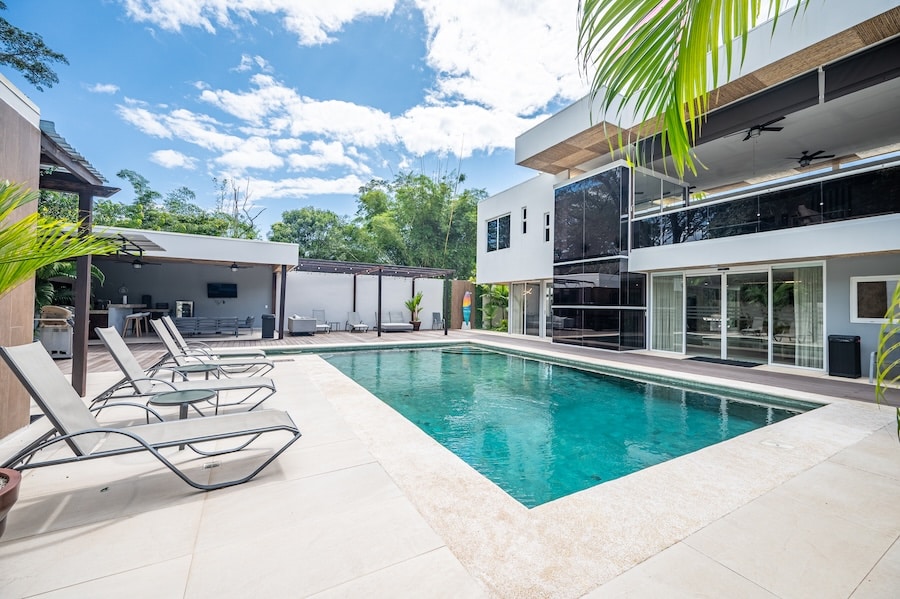 Experience luxury in Jaco with our vacation rental! Our new tropical villa, Casa Sundeck, is perfect for bachelor parties and is just six blocks from Cocal Casino. Enjoy all-inclusive VIP packages with a dedicated driver. Eight master bedrooms, nine bathrooms, and high-end finishes ensure unmatched comfort. Located near downtown Jaco Beach, our property offers complete privacy for your celebration. Relax with friends by the inviting pool with aqua green tiles. Your ultimate party experience awaits!